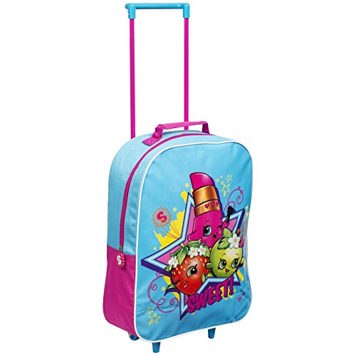 Any little Shopkins fan will love travelling with this trolley bag on sleepovers, holidays, school trips or weekends away. This lightweight bag has a telescopic handle and 2 wheels on the base making it really easy to move around. The large compartment has a zip fastener with Shopkins logo on the zip pull, is made from durable polyester material and has a grab handle on the top. With a full colour wipe clean print of Shopkins characters on the front, this bag is a great gift idea for any little Shopkins fan on the move This bag meets most airline cabin bag size restrictions (please check with your airline first) Suitable for ages 3+ Bag dimensions Height 42cm (66cm with handle extended) Width: 28cm Depth: 14cm Bag weight: 480g Perfect luggage for kids!
